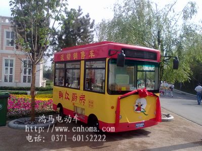 該車車身主題為黃色,車頂和底部為橙色,并且印有“流動(dòng)銷售車,群眾廚房”等字樣,再加上頭戴廚師帽的卡通人物形象,讓人感覺(jué)倍加親切。車的前后各有一塊LED顯示屏,可以使我們的廣告語(yǔ)或者宣傳口號(hào)循環(huán)展示。車的內(nèi)部布置合理,除了桌椅以外,還有空調(diào),貨架,櫥柜等等。放上商品,就是一個(gè)小型店鋪,最重要的是它可以隨時(shí)移動(dòng),比較靈活,更加適應(yīng)現(xiàn)代化快節(jié)奏的都市生活。行駛在大街上,宛如一道亮麗的風(fēng)景線。