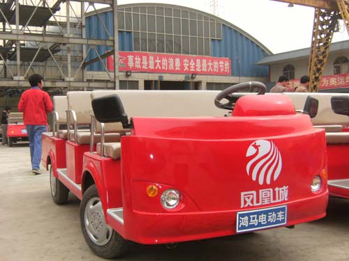 鄭州市鳳凰臺(tái)建材市場(chǎng)使用的河南鴻馬電動(dòng)汽車生產(chǎn)的特寬電動(dòng)觀光車