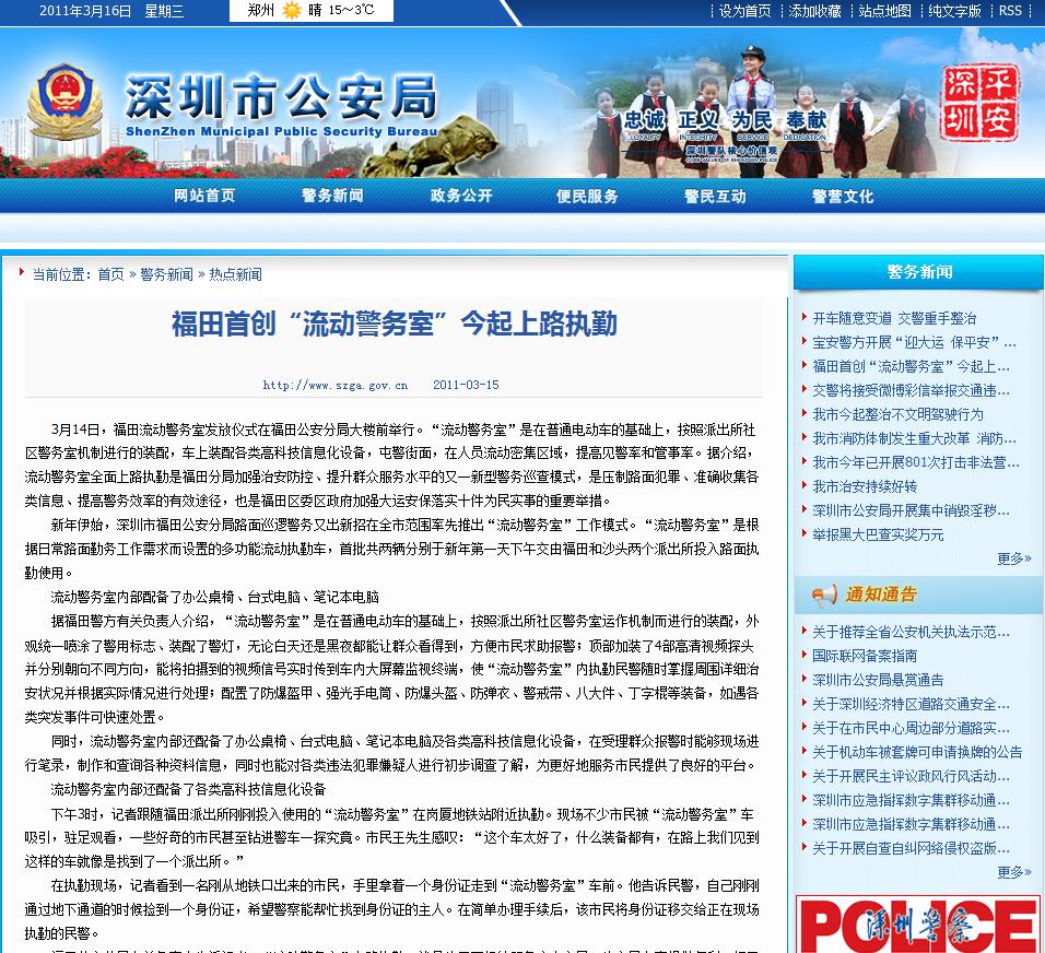 新年伊始,深圳市福田公安分局路面巡邏警務(wù)又出新招在全市范圍率先推出“流動(dòng)警務(wù)室”工作模式。“流動(dòng)警務(wù)室”是根據(jù)日常路面勤務(wù)工作需求而設(shè)置的多功能流動(dòng)執(zhí)勤車,首批共兩輛分別于新年第一天下午交由福田和沙頭兩個(gè)派出所投入路面執(zhí)勤使用。
