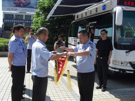 湖南益陽(yáng)市局領(lǐng)導(dǎo)為鴻馬移動(dòng)警務(wù)室工作人員頒發(fā)“流動(dòng)紅旗”