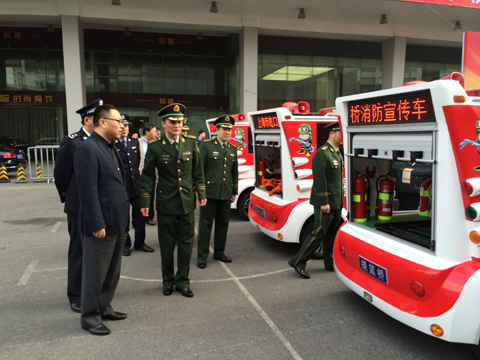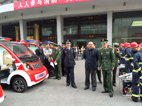 上海虹口區(qū)區(qū)長(zhǎng)曹立強(qiáng)(中)參觀鴻馬消防宣傳車