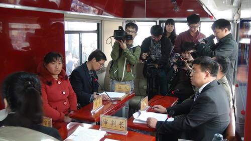 工作人員在移動(dòng)法庭內(nèi)審理案件