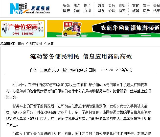 6月26日,在步行街億家超市購物的李女士不慎將1部價值5000元的蘋果手機遺失在購物車內(nèi),心急如焚的她看到步行街前門停放的喀什市公安局流動警務(wù)車后,抱著最后一絲希望上前報警求助。