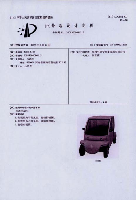 鴻馬電動(dòng)汽車公司生產(chǎn)的卡通電動(dòng)車,外觀設(shè)計(jì)已獲專利,本外觀設(shè)計(jì)巾幗中華人民共和國(guó)國(guó)家知識(shí)產(chǎn)權(quán)局依照中華人民共和國(guó)專利法進(jìn)行初步審查,決定授予專利權(quán),頒發(fā)外觀設(shè)計(jì)專利證書并在專利登記簿上予以登記。