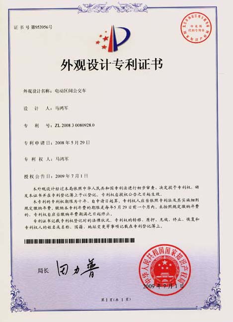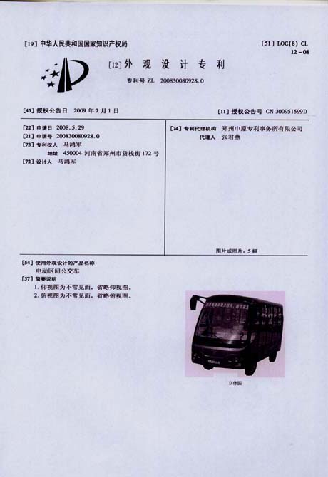 鴻馬電動汽車公司生產(chǎn)的電動區(qū)間公交車,外觀設(shè)計已獲專利,本外觀設(shè)計巾幗中華人民共和國國家知識產(chǎn)權(quán)局依照中華人民共和國專利法進(jìn)行初步審查,決定授予專利權(quán),頒發(fā)外觀設(shè)計專利證書并在專利登記簿上予以登記。